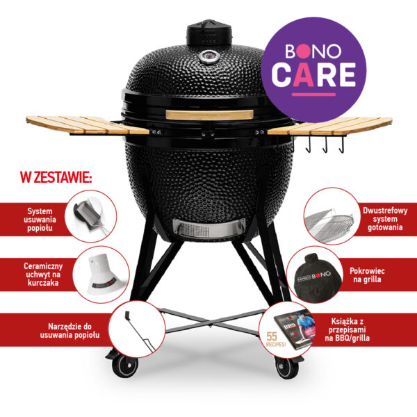Jest to największy grill Kamado Bono, o wyjątkowo dużej powierzchni grillowania. Idealnie nadaje się do ogrodu, na taras, do domów wypoczynkowych i lokali gastronomicznych. Dla osób fizycznych wszystkie części ceramiczne są objęte nieograniczoną gwarancją i ochroną Bono Care.