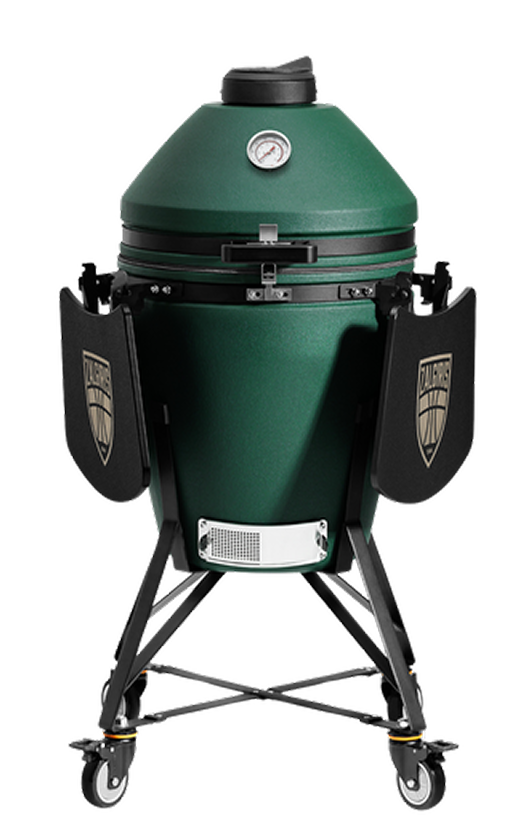 Grill ceramiczny z podstawą na kółkach i półkami bocznymi